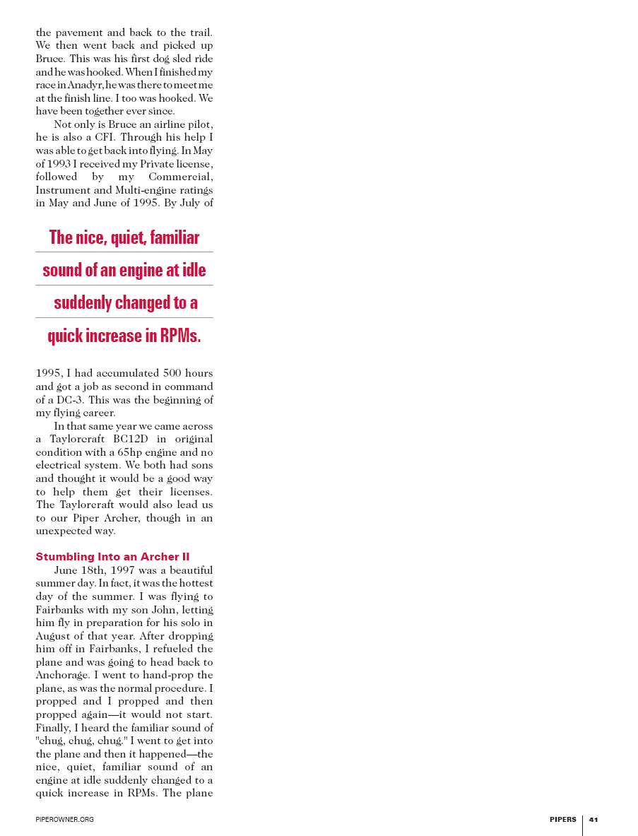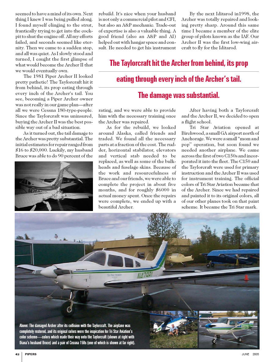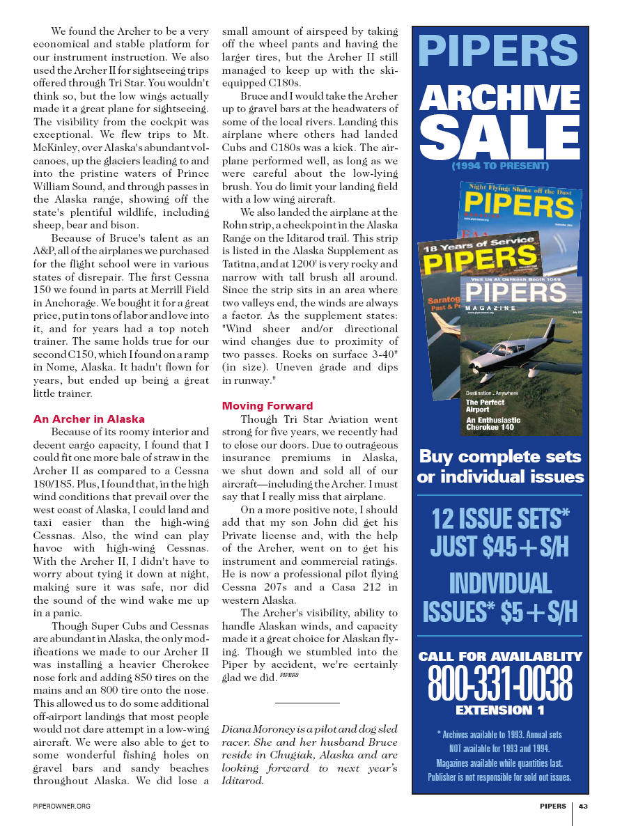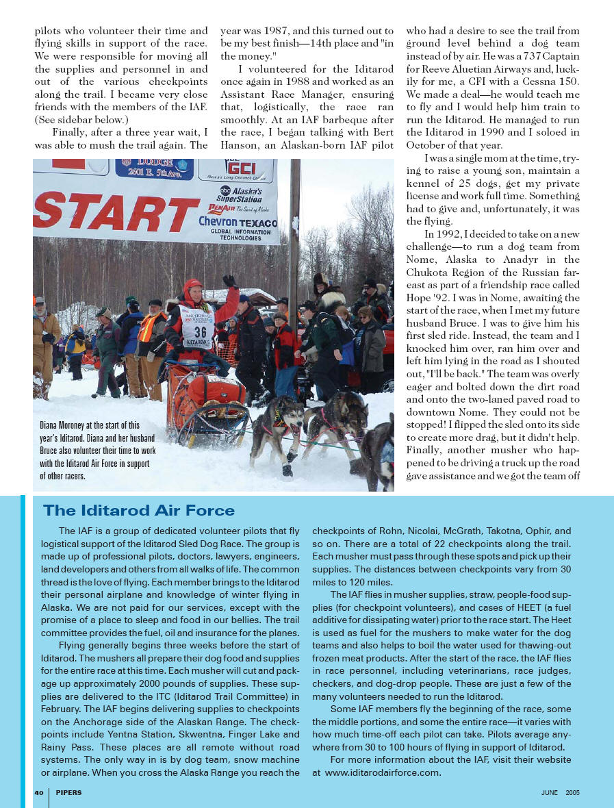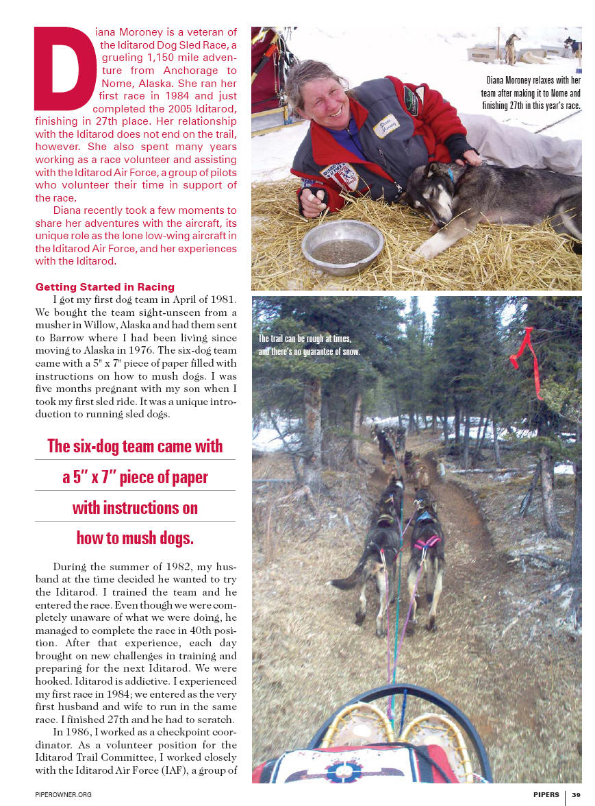 March 2005. After Diana's 10th run to Nome, Pipers Magazine contacted Diana for an article on Iditarod and Diana, the only woman pilot flying for the Iditarod Airforce